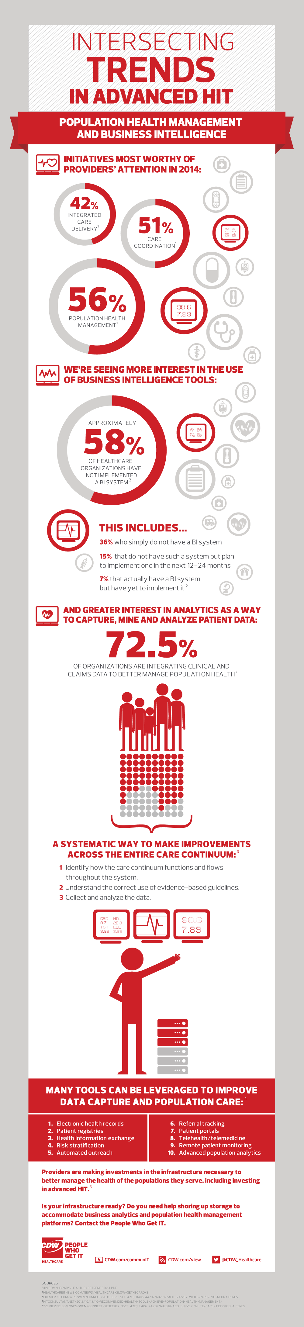 72.5% of healthcare organizations are integrating clinical and claims data to better manage population health. In order to successfully take advantage of that data to improve care coordination, healthcare providers must learn to utilize population health management and business intelligence tools. The infographic shown below created by CDW Healthcare illustrates how population health management and business intelligence tools are playing a bigger role in the changing HIT landscape.