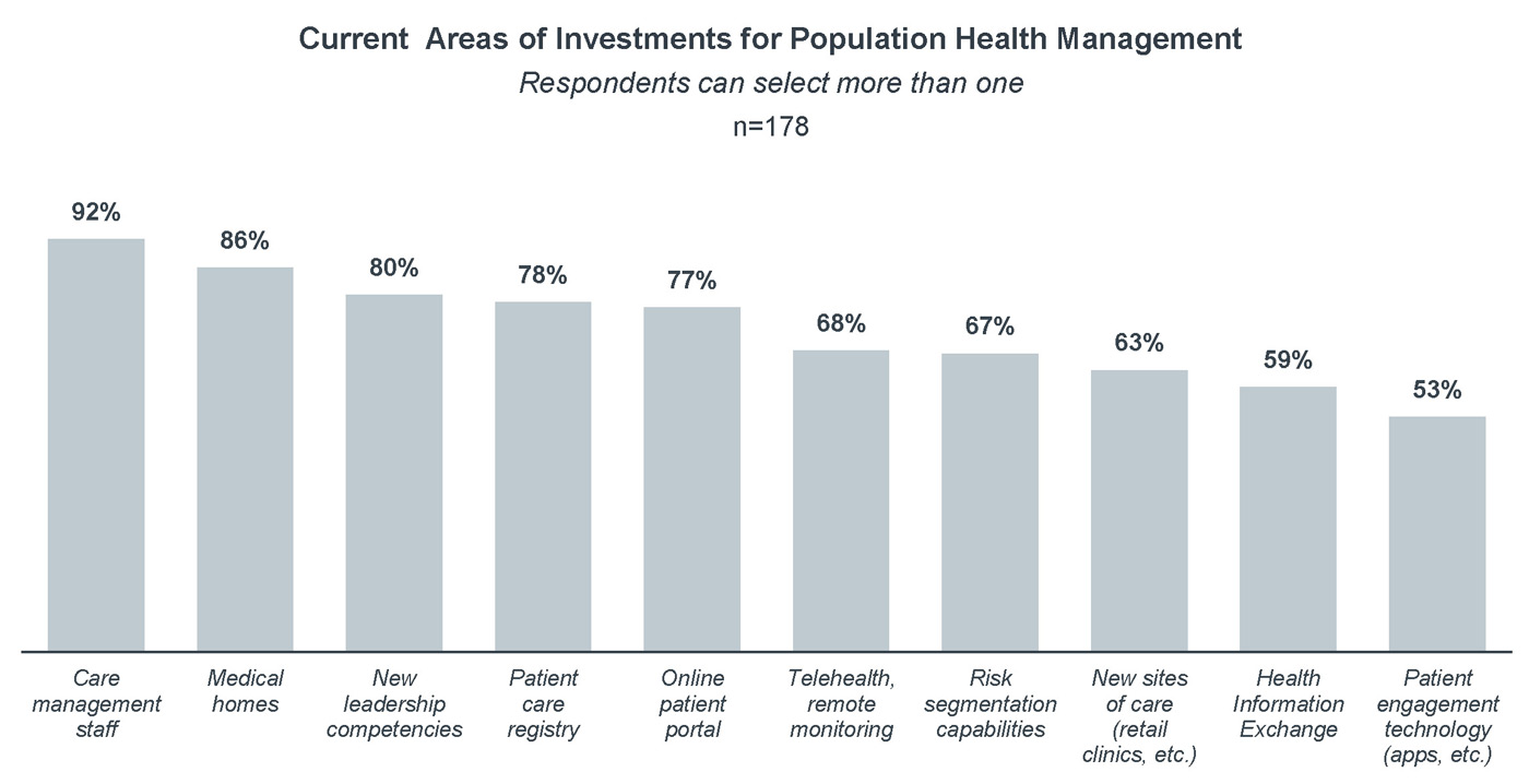 For population health managers, the top three investment areas identified are: a flexible care management workforce, analytics to drive value from IT, and a preferred partner network. For more information, see the images below: