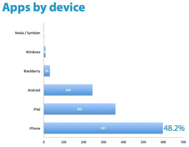 In terms of platforms (devices), the Apple iPhone is by far the leader, with 48.2% of the market share, followed by the iPad, then Android, Blackberry and Windows phones. This clearly shows that Apple iOS is a mature platform for medical devices; but Android (which is a distant second) and Windows (which lags further behind) are coming up. As for Blackberry, the future doesn’t look so promising, unless the mobile phone maker can regain its lost clout.