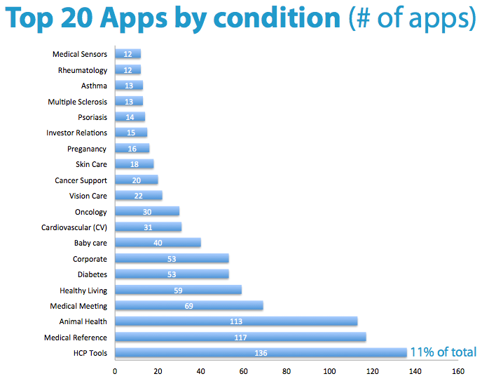 In terms of mobile app evolution, there are three waves: maturing apps to assist care providers, evolving apps for patient support and emerging apps for care monitoring. While wave 1 apps are of a more informal nature, wave 2 apps are passive to active and wave 3 apps work in real time. HCP tools lead the way with an 11 percent market share, followed closely by medical reference, animal health, medical meeting, healthy living, diabetes and corporate apps.