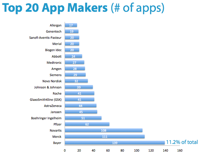 It’s not surprising that the medical app market is dominated by the big players, since they have the resources to create the best apps and the financial muscle to push their products in the market. The lion’s share of the medical apps market is occupied by established companies with historically strong brands. Bayer leads the pack with 11.2% market share, followed closely by Merck, Novartis, Pfizer, and Boehringer Ingelheim.
