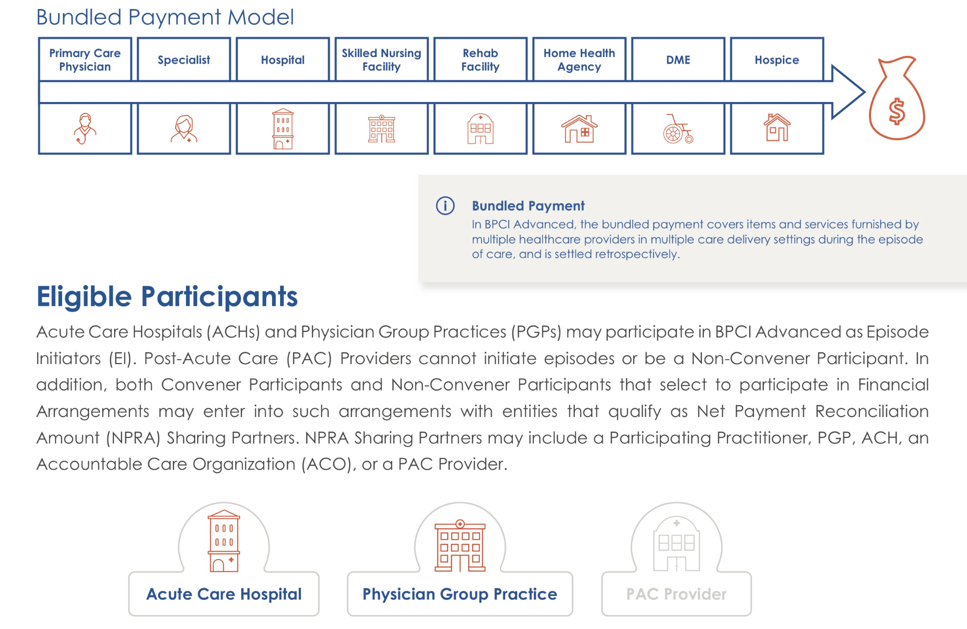 BPCI Advanced aims to encourage clinicians to redesign care delivery by adopting best practices, reducing variation from standards of care, and providing a clinically appropriate level of services for patients throughout a Clinical Episode. Under BPCI Advanced, providers prospectively agree to a pre-defined reimbursement amount for 32 Centers for Medicare and Medicaid Services(CMS)-defined episodes of care or chronic conditions. Bundled payment offerings can support better health care experiences for consumers with greater cost transparency, while also improving efficiency and reducing waste for health systems and providers.
