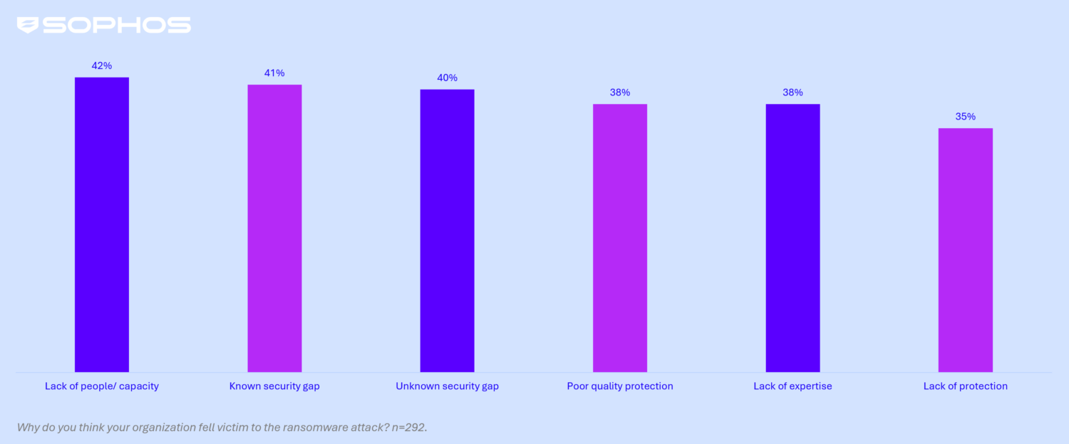 - Top Organizational Cause: The most common organizational factor contributing to attacks was a lack of people/capacity (i.e., insufficient cybersecurity experts monitoring systems), named by 42% of victims. This was closely followed by known security gaps (weaknesses organizations were aware of but had not addressed), cited in 41% of attacks.