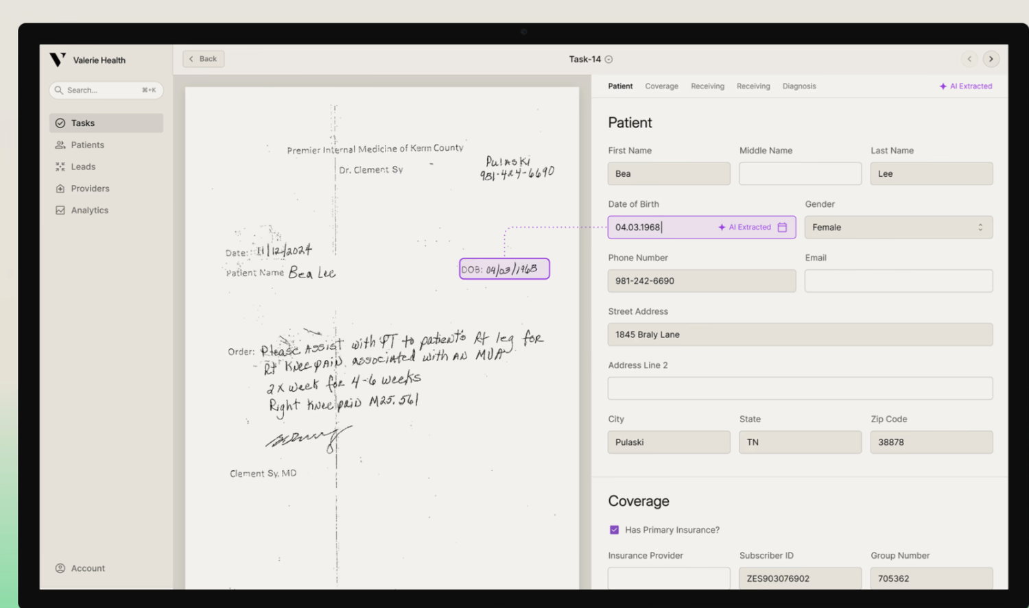 At its core, Valerie addresses a long-standing pain point in outpatient care: the overwhelming volume of unstructured administrative data that flows through front offices every day. Referrals arrive via fax, email, portals, and EHR inboxes, often incomplete, inconsistently formatted, and difficult to track. Valerie’s platform applies large-language-model (LLM) and vision-language-model (VLM) technology to read, classify, and extract structured information from virtually any document format, regardless of source.