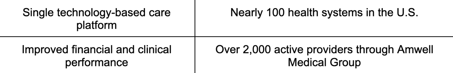 Amwell makes telemedicine easier through its technology-based care platform. The company works with nearly 100 health systems and over 2,000 active providers nationwide. Since 2006, it has facilitated care between patients and hospitals by simplifying the experience. You can count on personalized engagement for better clinical and financial outcomes.
