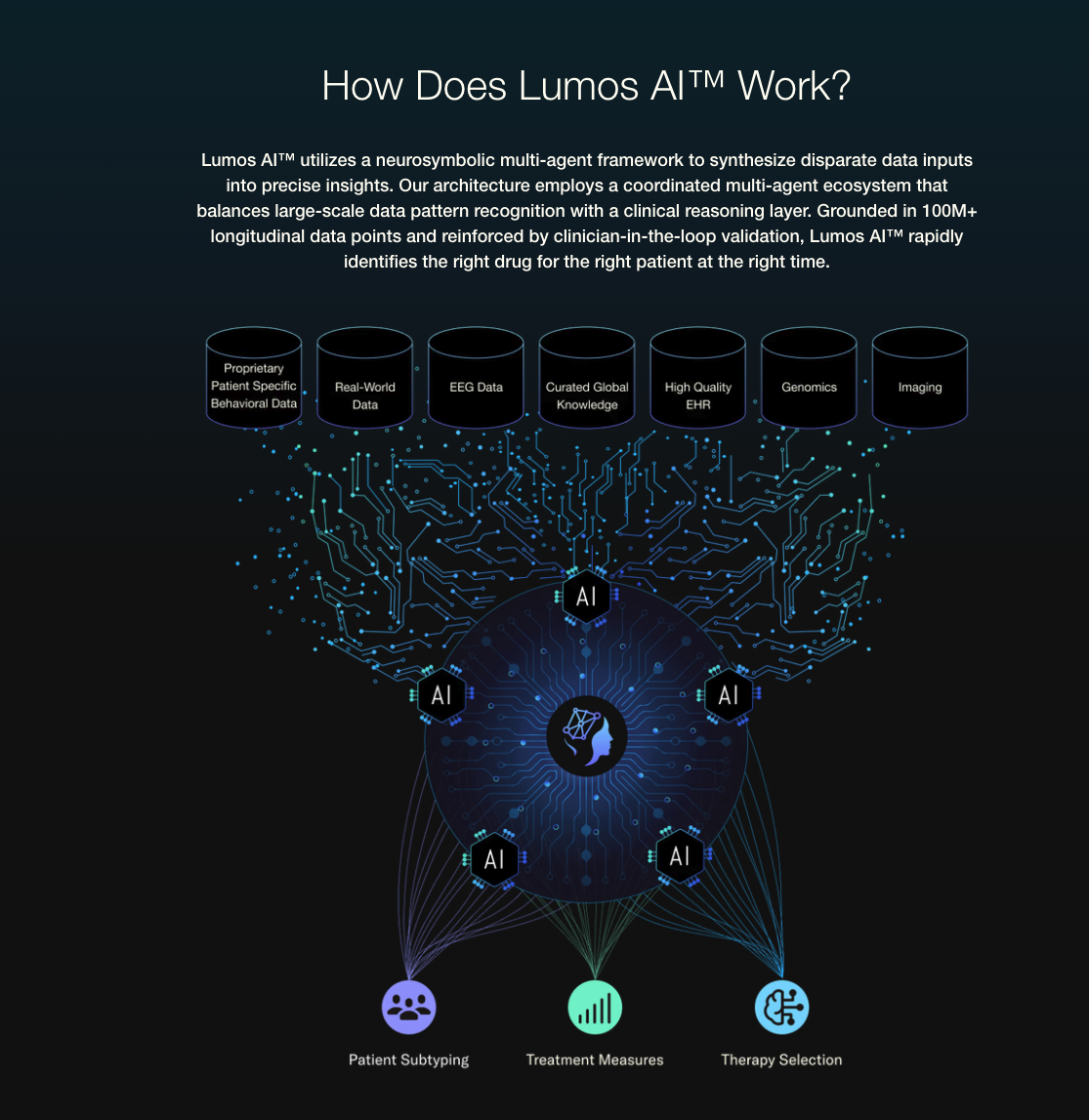 – Unlike tools focused on trial logistics, Lumos AI utilizes longitudinal real-world data and clinical logic to identify patient subtypes most likely to respond to a therapy, aiming to bring the precision-based success of oncology to the field of psychiatry.