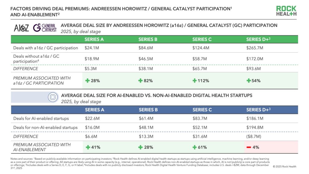 AI-enabled companies captured 54% of total funding in 2025, commanding a 19% premium on average deal size. This was most pronounced at Series C, where AI startups saw a 61% premium. Simultaneously, wellness and fitness startups (led by Oura’s $900M round) vaulted to the third-most funded value proposition as D2C lab testing and longevity became mainstream consumer priorities.