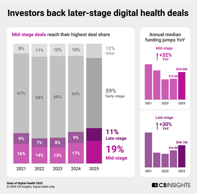• The Rebound: According to the new State of Digital Health 2025 report from CB Insights, digital health funding rose 19% YoY to $22.3B in 2025, driven by fewer, larger checks—average deal size jumped 29% to $20.3M.